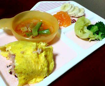 オムライスにミネストローネ、キャベツとブロッコリーの温サラダ、デザートは蜜柑とバナナ。