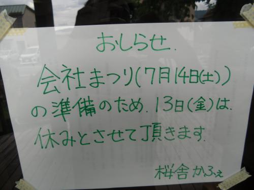 いつもご来店ありがとうございます。 9月14日(金)は年に一度の社内旅行のため、桜舎、桜舎商店、桜舎かふぇともにお休みとさせて頂きます。ご了承お願いします。 なお、かふぇは9月11日(火)11〜13時まで団体様のご予約を頂き、お食事を提供するのにお時間を頂くことになります。残りのお席も少なくなっておりますので、お手数ですがお電話の上ご来店お願いいたします。 20日(木)は貸し切りとさせて頂きます。 |