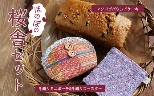 内容は、ほのぼの桜舎セット(マクロビレーズンパウンドケーキ1本、手織りミニポーチ1つ、手織りコースター1枚)です。