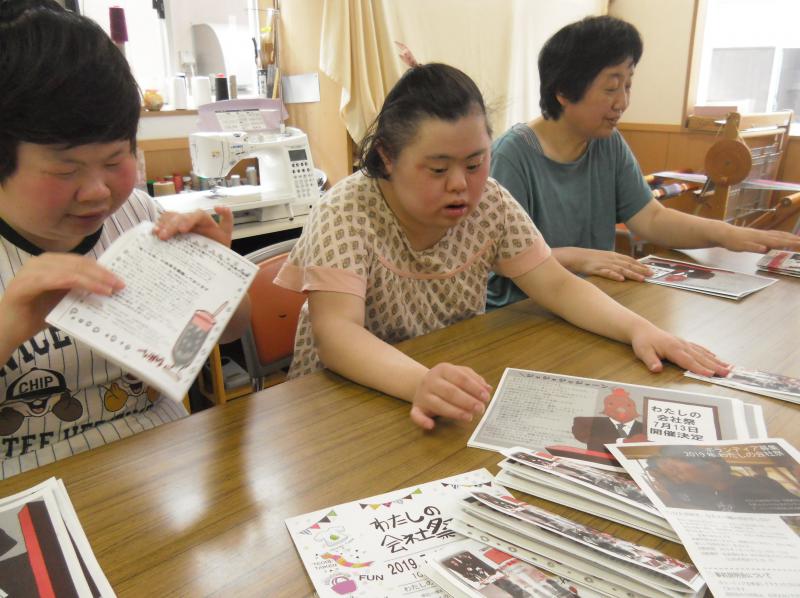 会社祭のチラシと会報折りをしています。