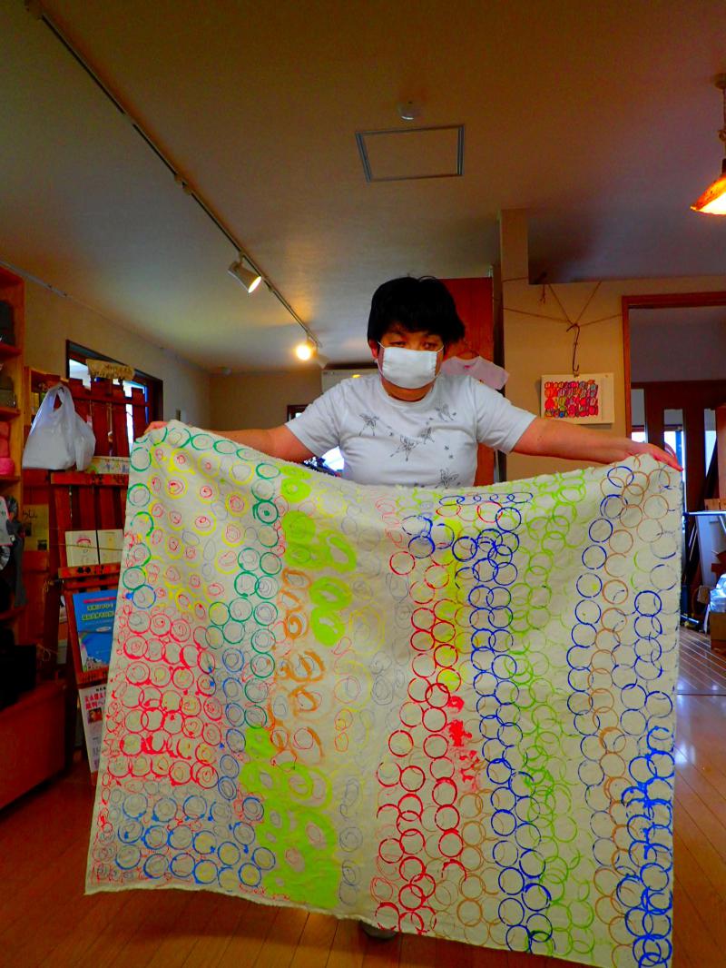 このカラフルな水玉模様は、あとりえのアーティスト・貴栄子さんが布用染料で描き上げたものです。