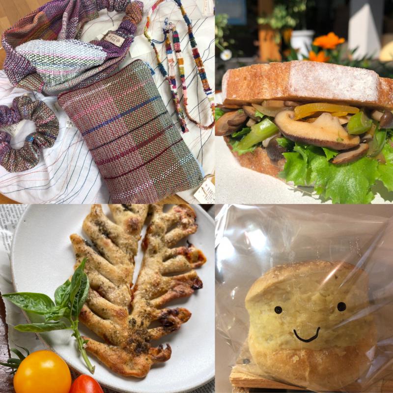 利用者さんたちが糸で一本一本丁寧に織り上げた布で作ったポーチやシュシュなど。