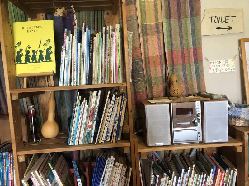桜舎かふぇにはたくさんの本や絵本が壁いっぱいにおいてあります。