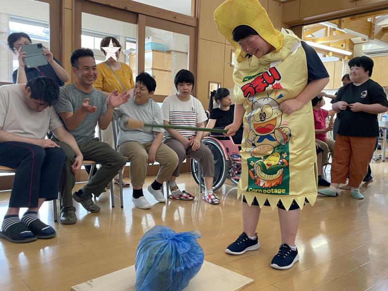 まずは豪快スイカ割り〜! ガンガン叩く方、 ちょんちょんつつく方、 まずは変装する方、