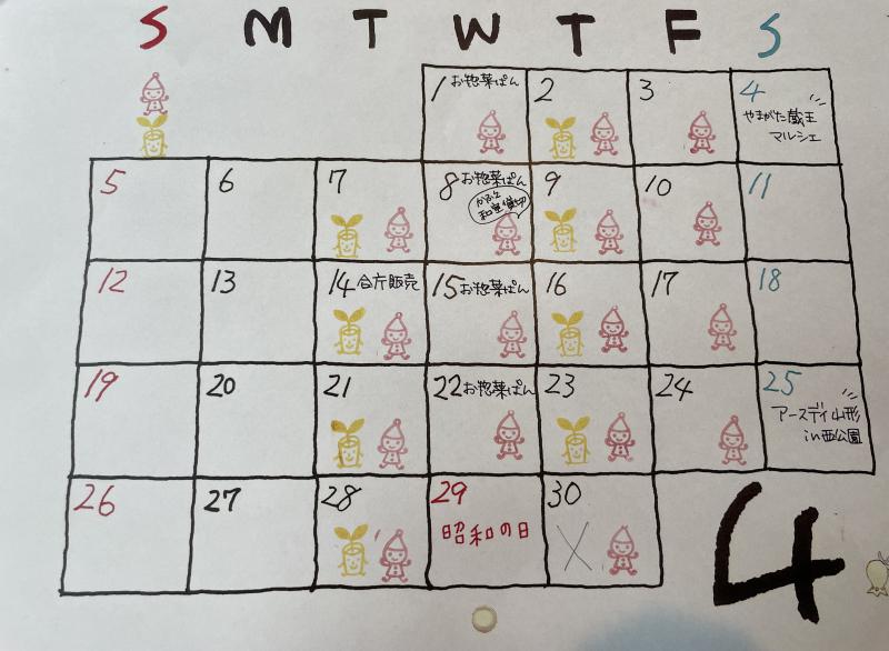 4月営業日カレンダーです (葉っぱくんマークが焼きたてぱん こびとさんマークがかふぇ営業です)