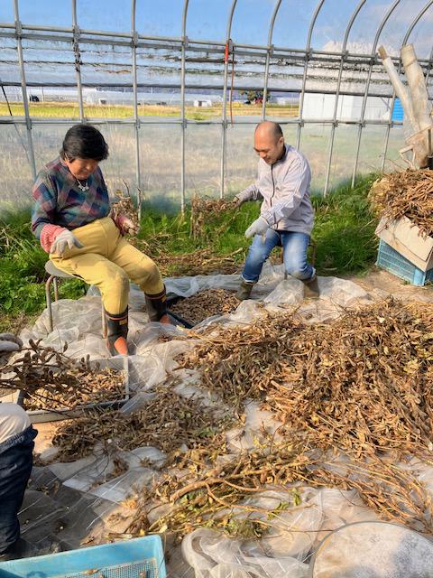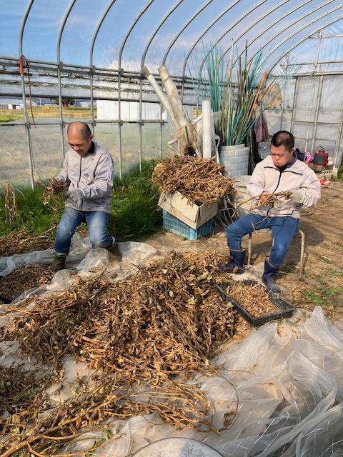 一方、ハウスの中では来年の種豆となるかもしれないし、「味噌」になるかもしれない大豆のカラむきを行いました。慣れた手つきで、利用者さんが次々と豆をむいてくれました。丸くて美味しい豆に育ってくれることを願いながら、黙々と作業に励んでくださいました。この大豆たちは、来年には、味噌や餃子の具材として活躍するかもしれません。たくさんの可能性を秘めた豆たちの未来が楽しみです。