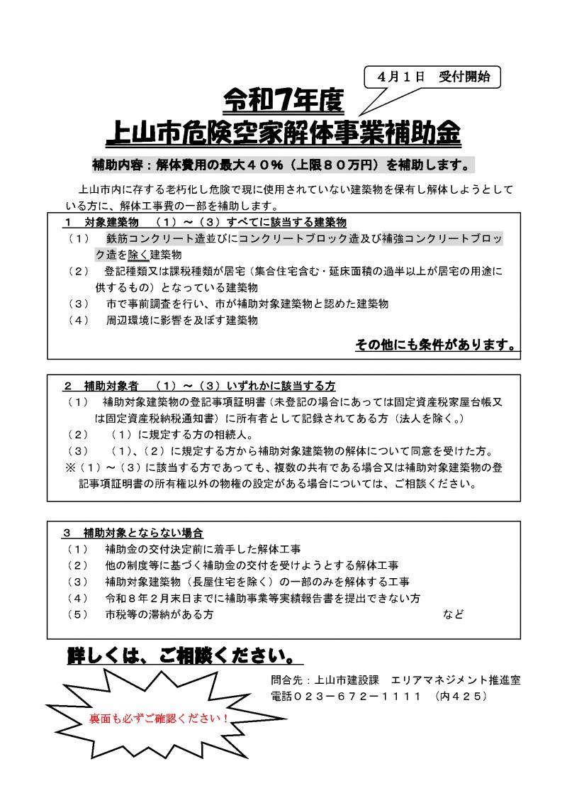 上山市内の、老朽化し危険な現在利用していない住宅の解体工事を実施される方に、市より解体費用の一部が補助されます。◇危険空家解体事業補助金◇ 解体費用の最大40%上限80万円