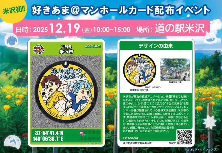 山形県米沢市を舞台とした長編アニメーション映画「好きでも嫌いなあまのじゃく」の公開・配信を記念し、映画の主人公「柊とツムギ」をデザインしたご当地マンホールを製作し、映画のロケ地である「西條天満公園」に設置しています。