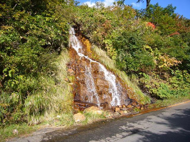 茶色に染まる鉄分を帯びた滝が道路脇に流れ落ちていた