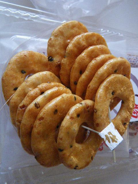 お金をかやどった穴のあいたユニークなおせんべいです。