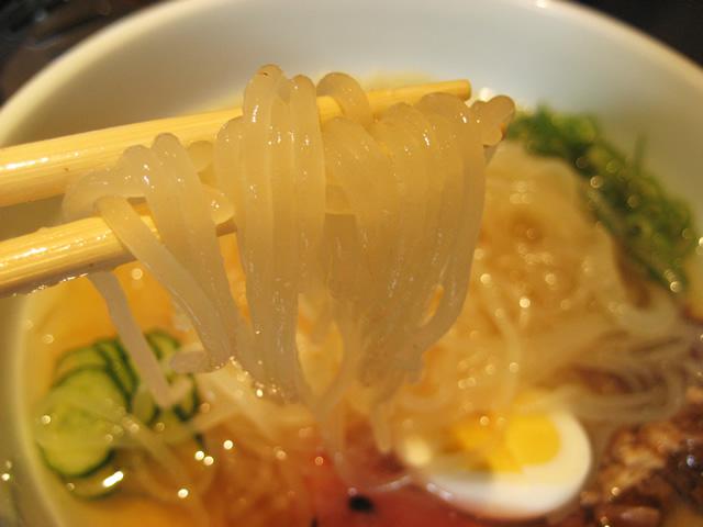 手打平壌冷麺のアップです。元来平壌冷麺とはそば粉を使用するため黒っぽく噛みやすい麺だそうですが、日本人の口に合うよう改良が加えられ、現在のようなコシのある透き通った麺になったとも言われています。