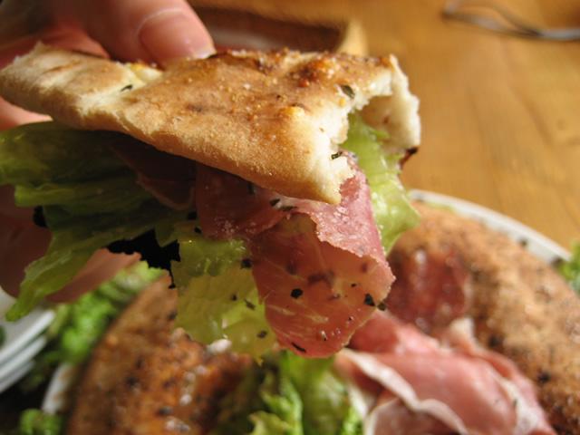 パリパリのピザ生地に生ハムとサラダを挟み、お好みでオリーブオイルをつけていただきます。
