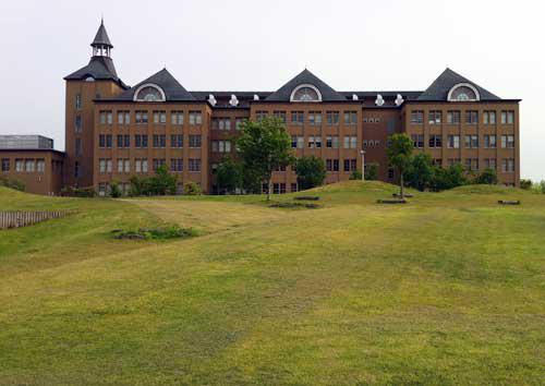 山形県立保健医療大学(やまがたけんりつほけんいりょうだいがく)がそびえます。