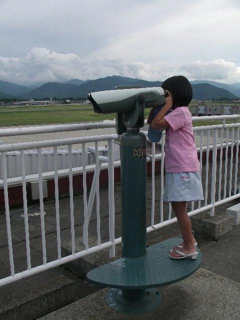 双眼鏡で、飛行機のメンテナンスする整備員を見ています。