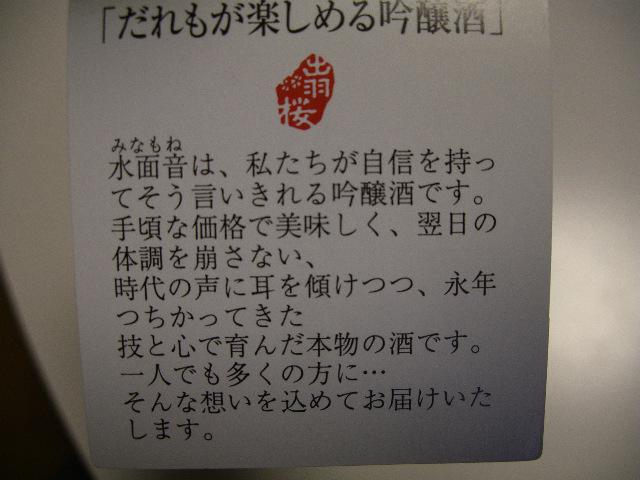 水面音(みなもね)は、私たちが自信を持ってそう言いきれる吟醸酒です。手ごろな価格で美味しく、翌日の体調を崩さない、時代の声に耳を傾けつつ、永年つちかってきた技と心で育んだ本物の酒です。一人でも多くの方に・・・そんな想いを込めてお届けいたします。