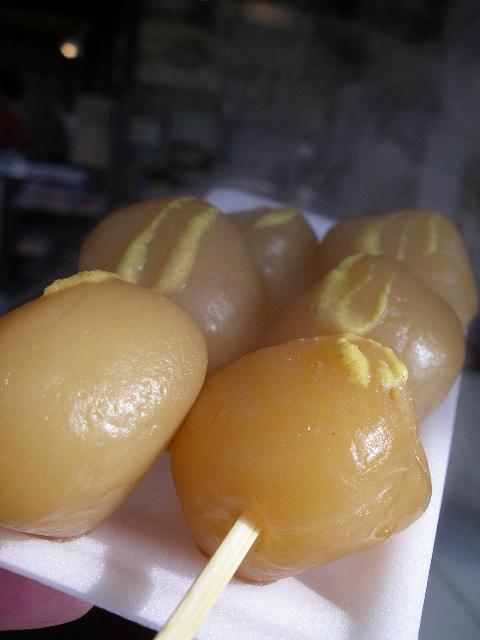 本家の丹野醤油共同開発の「玉こんにゃく専用秘伝醤油」と「短時間で味がしみる製法」で味わい深く柔らかい食感の玉コンニャクが楽しめます。。お好みで「和からし」をつけてほおばります。
