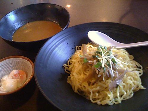 鳥ごぼうがのったカレーつけめんに温泉たまごがついてきます。