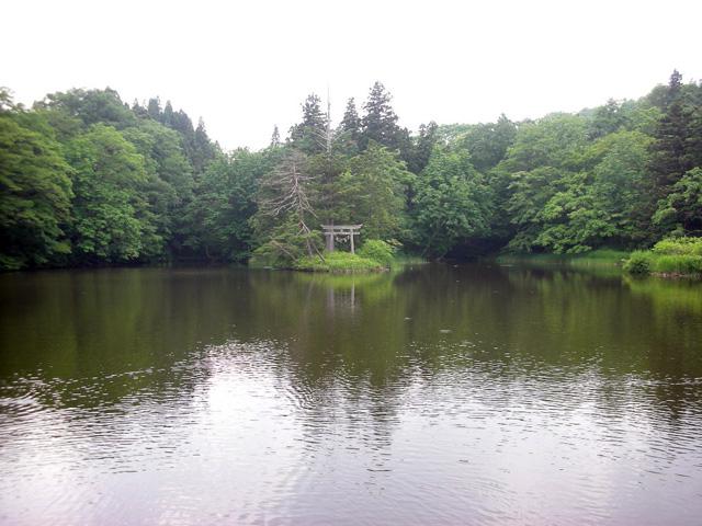 朝日町の浮島稲荷神社の境内にある大沼(おおぬま)の浮島(うきしま)です。