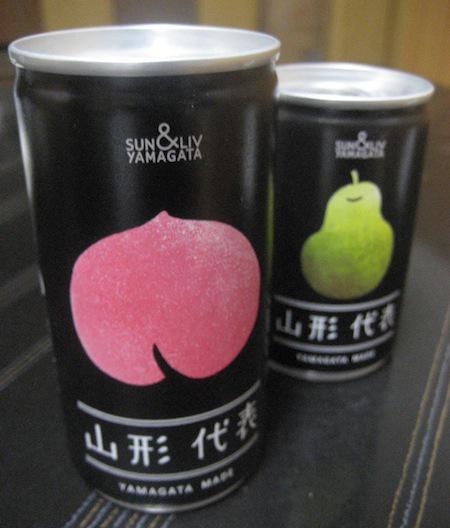 山形産フルーツの果汁を100%絞ってジュースにした《山形代表もも》と《山形代表ラ・フランス》です。