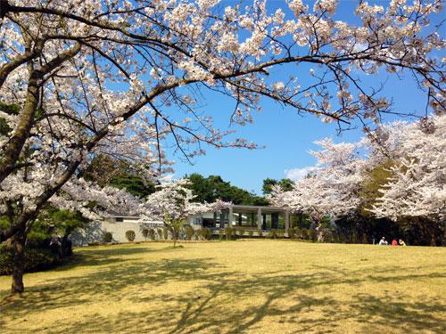 桜並木と芝生の広場があります。
