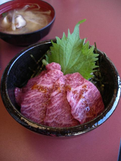 山形市はクリエイトセンターご近所の花果苑。山形産和牛を贅沢に使った《霜降り丼/しもふり丼》です。中盛り1400円也。酢飯(お寿司屋さんでいうシャリ?!)の上にシソの葉っぱと霜降り牛をのっけたどんぶり。牛は舌の上でとろけるほどの味わいです。