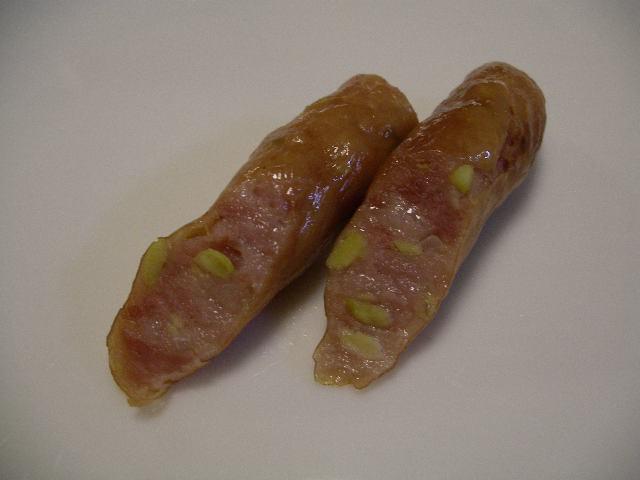 米沢牛と豚肉だけを使用し、肉の風味と香りを引き立たせるために 香辛料を抑え低温で長時間熟成、乾燥させた本格サラミや、米沢牛をふんだんに使うことにより、深い味わいと旨みを出した スパイシーで贅沢な中辛の米沢牛入カレーで有名な置賜畜産公社の「米沢牛入りウィンナー」です。写真は、めずらしい「だだちゃ豆入り米沢牛入りウィンナー」です。