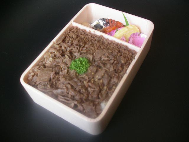 山形県産米「どまんなか」をふっくら炊き上げその上に特製のタレで味付けした牛そぼろと牛肉煮をのせた牛丼風のお弁当です。