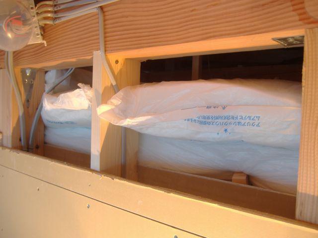 2Fの天井断熱材は厚さ105o物を2重に竪横になるように敷き詰めてあります。