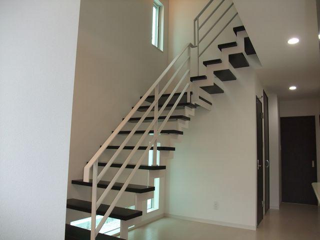 白と黒のデザイン階段、明かり取りの窓が各所に配置されています。
