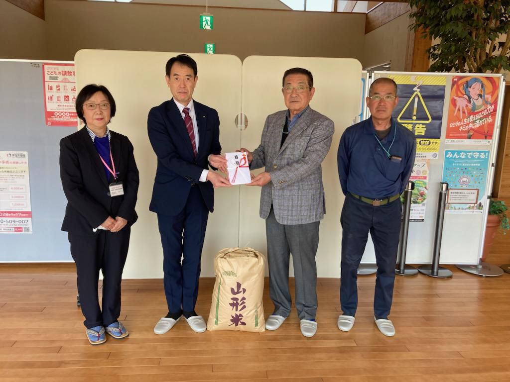 令和8年4月6日、山形架設工業株式会社 代表取締役 鈴木紀雄様から、「地域福祉事業の推進のため」(地域食堂など)として、寄附金5万円と玄米30キロをいただきました。