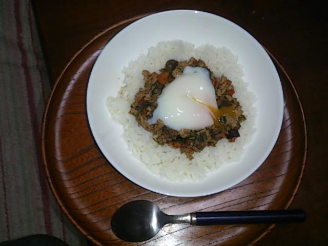 挽き肉、なす、ニンジン長ネギ、ミョウガをしょうゆベースで味付けラジウム卵をのせて出来上がり。