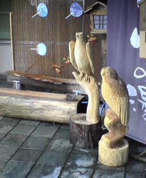 チェーンソーアート三点。冷足泉・鷹・フクロウ。荒々しいが何とも言えない味わいがある。