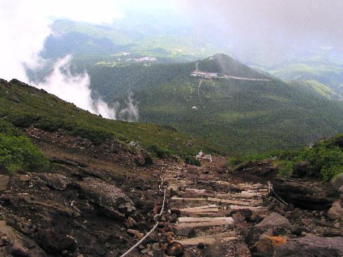 ガスが切れれば眺めが良くなります。下の山の麓に見えるのが登り始めた駐車場です。そこは2,200m位ですから3,000mを越える山と言ってもたいしたことはありません。