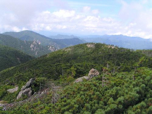北西から北にかけてはだいぶ晴れてきました。遠景に、かすかに八ヶ岳が見えます。右手前の山は次に登る国師ヶ岳です。