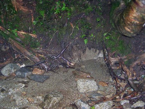 先ほどの標識の左側に沢があり、最初の一滴はこんな様子です。小さな穴から清水がこんこんと湧いていました。
