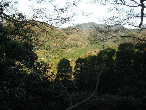 山頂へ向かう尾根道の右(北西)側の樹間に鋸山が見えてきます。