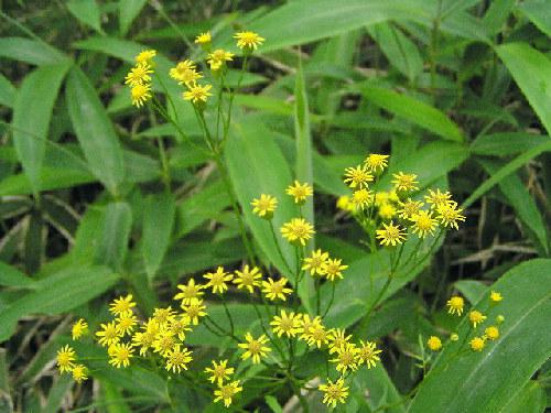 唐松の樹林を経て、林道を横切り広葉樹林を下り、上日川峠にもう少しというところで沢に出ます。やはり水辺の植生は違うようでサワギクの群生が見られました。