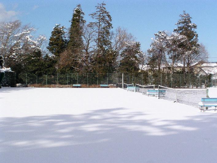 自然に溶けるのを待ちきれない、せっかちなメンバーが7名ほど結集、どけたら山に積んだ場所から流れ出た水が凍って、余計に始末に負えなくなるのを学習しているので、足で縦横に筋を入れて自然溶解を待つことにしました。5面のコートの処理を終えるのに午前中いっぱい費やしてしまいました。テニスをやるのよりは余程大きな運動量になり、またビールを飲む羽目になってしまいました。