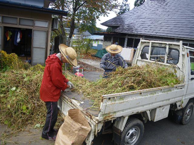 株ごと抜いて、軽トラの荷台の上で莢もぎをしますと腰が楽です。