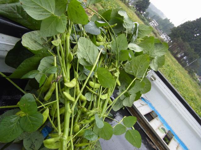 子どもに鞘もぎからさせたいとのことで、朝一に引っこ抜いた枝付き豆をお届け。