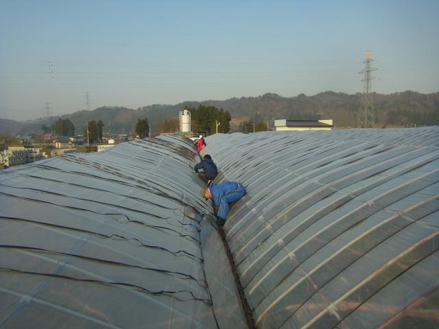 雨よけハウスのビニールの張り方を手伝ってきた。