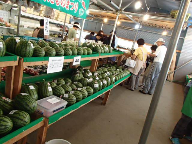 スイカ、丸ナスを求めるお客さんで開店前の行列&争奪戦。