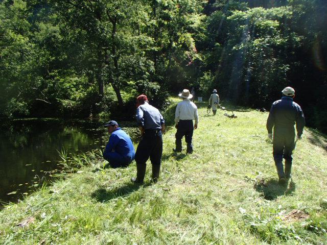 伊佐沢内で田んぼの耕作者及び地主さんら総出で、堰と水路の草刈り作業です。
