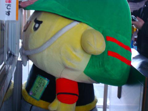 (2012.4.1)つばさのお出迎えにゆるキャラフル出演..つばさを待つ間、駅改札前で写真撮影です。画像は駅改札口を出入りする「かげっちさま」ですが、頭がデカく改札口の幅が無いため、そ〜っと蟹歩き...