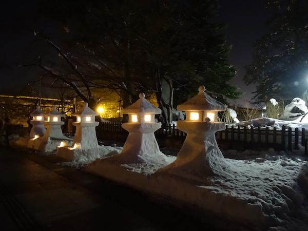 上杉鷹山公や直江兼続公を祀る松岬神社前の表参道の雪灯篭です。