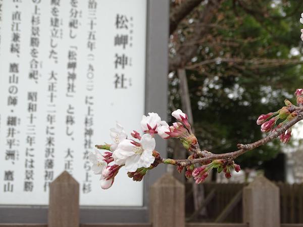 風がつよく時々小雨で寒い中、公園内の日の当たる場所の桜が咲き始めています。(画像は松岬神社前の表参道の桜)