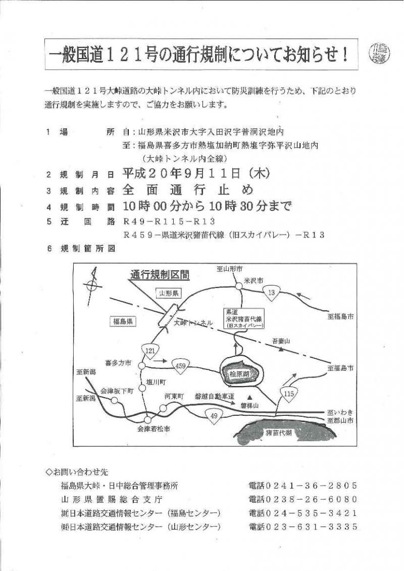 ◇121号線の一時通行止めについて連絡が