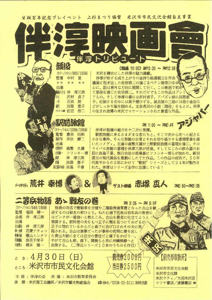 アジャパー!!で有名な、米沢市出身の喜劇スター伴 淳三郎氏が、来年没後25年、生誕100年を迎えるのを記念し、2006年に伴淳三郎生誕100周年映画会が開催されます。
