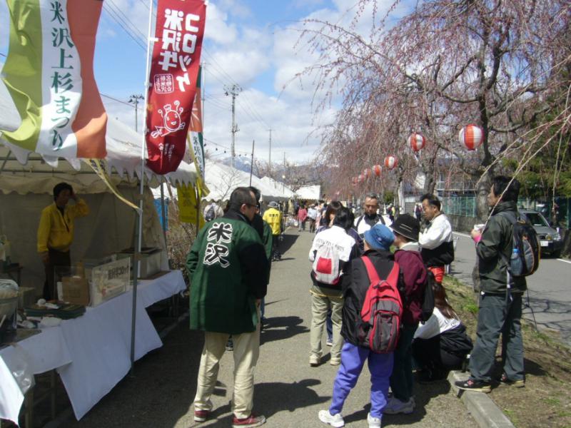 その方々たちのウォーク終了後にあわせて、喜多方桜ラーメン、お菓子、野点など様々なお振る舞いや物産販売コーナーをしだれ桜散歩道に設置したもので、米沢市もお呼ばれして参加してきました。