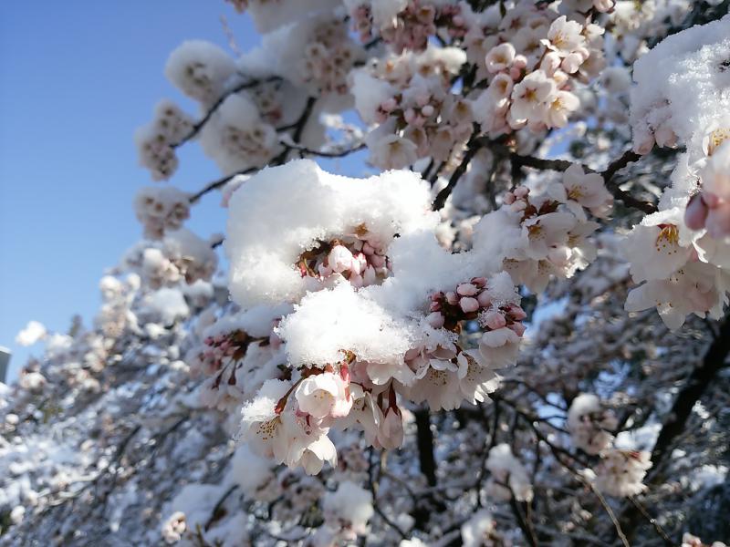 朝日に照らされた桜と雪の情景も珍しくて綺麗ですね。